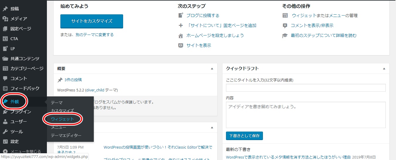 さてそれではいよいよメタ情報を表示しないようにする方法ですがこれはとても簡単で、まずダッシュボードの外観からウィジェットをクリックします。