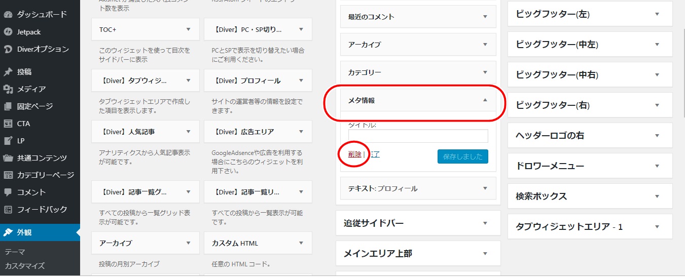 するとこんな画面になると思いますので、この画面のメインサイドバーというところにあるメタ情報をクリックすると削除というのが出ると思いますのでそれをクリックするとサイトの画面からもメタ情報という欄が消えていると思いますのでそれが確認できたら完了です。簡単だったでしょ?