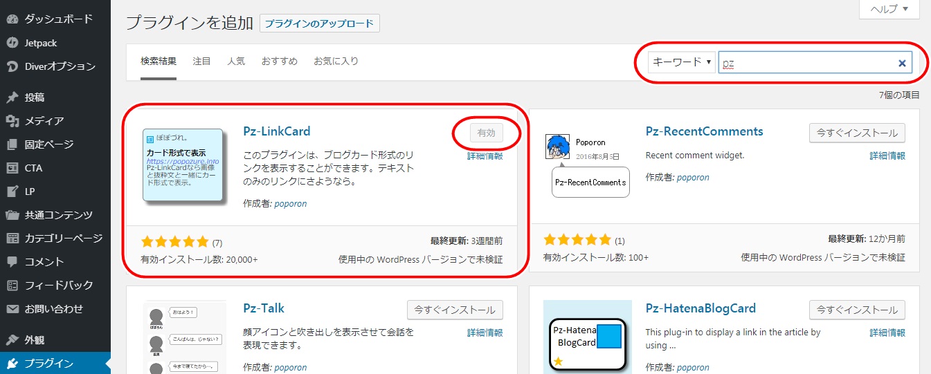 表示されたページでPz-LinkCardを検索して、今すぐインストールをクリックし、インストールが完了したら続けて有効化をクリックします。
