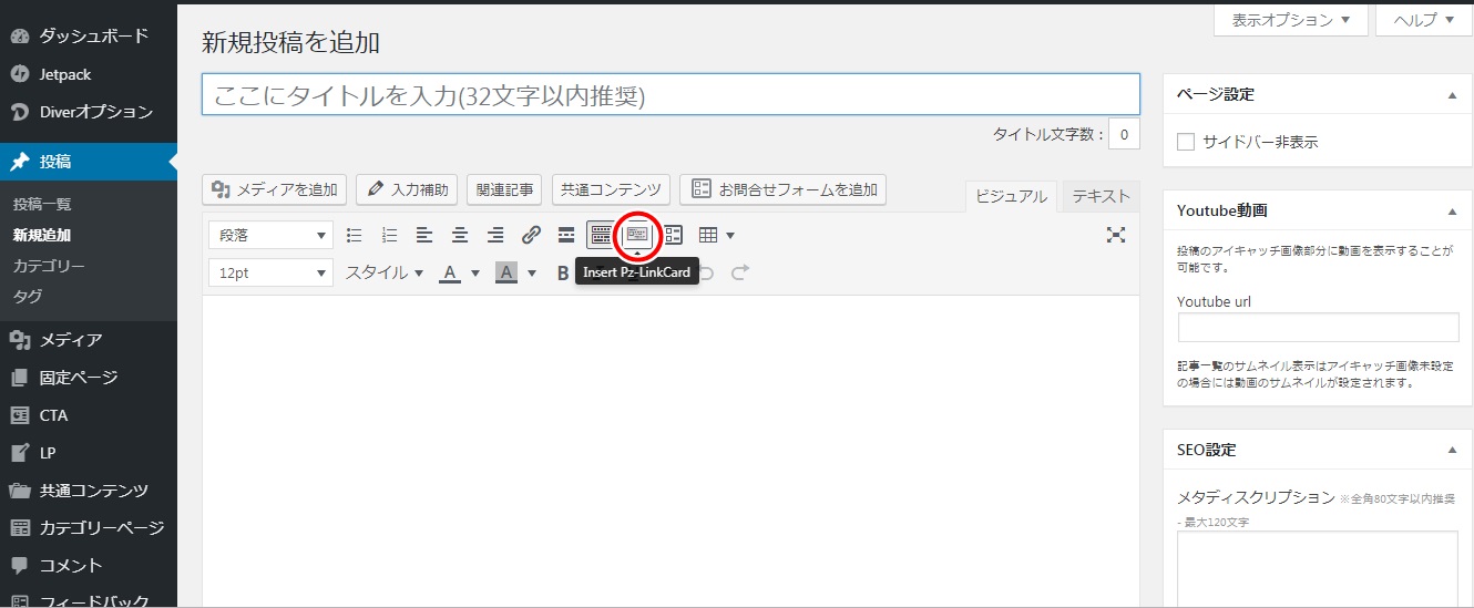Pz-LinkCardの有効化が済んだ状態で記事の投稿画面を開くと上の画像のようにリンクの挿入ボタンが追加されているはずですので、クリックします。