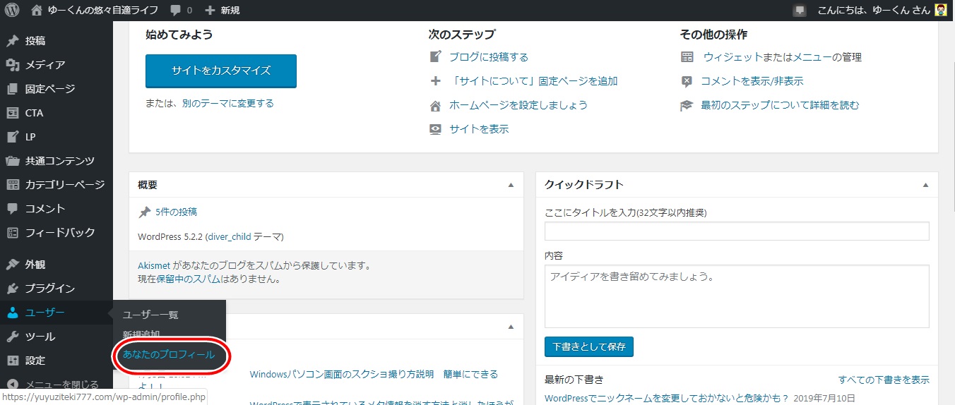 まずダッシュボードからユーザーの中のあなたのプロフィールをクリックします。