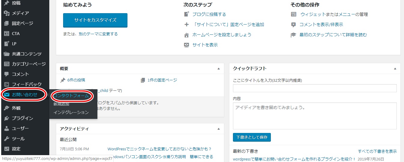 有効化されるとダッシュボードにお問い合わせが追加されるので、それのコンタクトフォームを選択します。