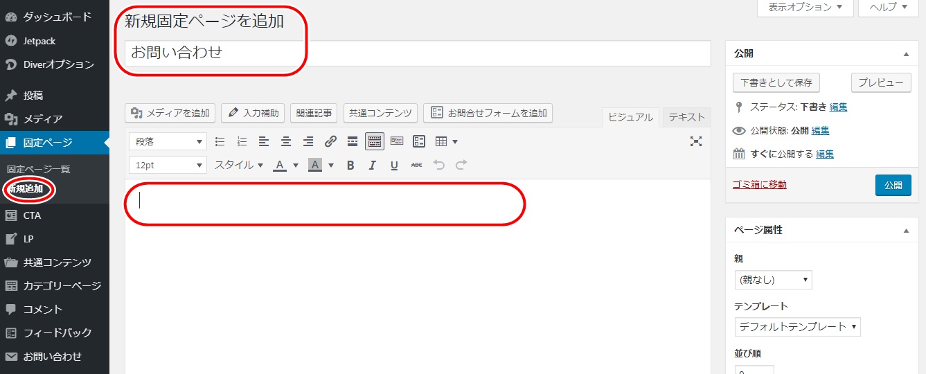 続いてダッシュボードから固定ページの新規追加をクリックして画像のページが表示されましたら、タイトルにお問い合わせと入力して本文のところに先ほどコピーしたショートコードを貼り付けます。