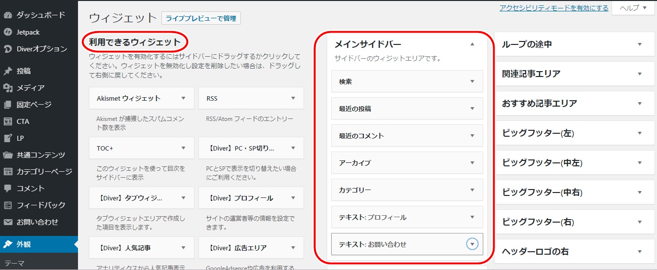 ダッシュボードの外観からウィジェットをクリックして利用できるウィジェットからテキストをドラッグ&ドロップでメインサイドバーにもって行きます。