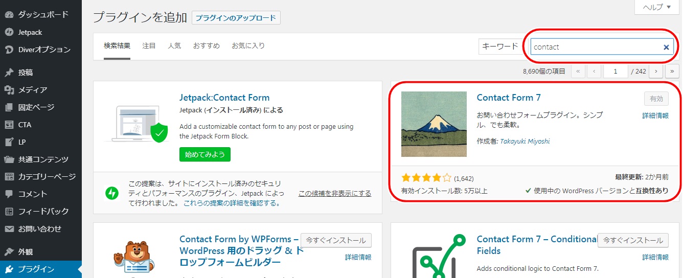 つづいてContact Form7を検索して今すぐインストールをクリックし、有効化を押します。